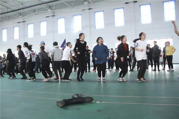 此次“袋鼠跳”全程往返為20米,以麻袋為道具。比賽規(guī)則是,隊員們排好隊,站在起跑線上,聽到發(fā)令后,進入麻袋,并向前跳躍,然后到了折返點后再跳回來,第二人接力,以此類推,直至4人全部完成,用時最短隊伍名次列前。