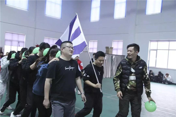 看我們心連心,連著一起向前走。本游戲要求裁判宣布開始后,6名隊員首先吹氣球,并將氣球系好;將系好的氣球放于2人之間并用額頭頂住進行前進,期間有氣球掉落則重新開始;隊伍行進距離50米,直至最后一個人穿過終點線,用時最少名次越前。通過本游戲來培養(yǎng)大家的團隊精神,提高隊員們配合、協(xié)作的能力。